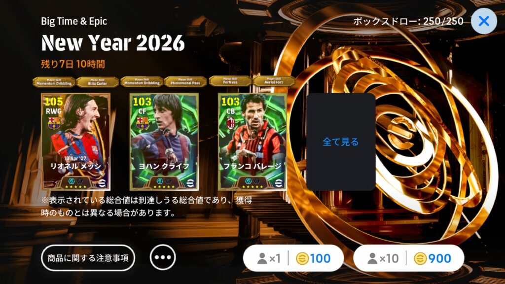 250Boxの為、今回のガチャは無課金でメッシを狙うのは厳しいかもしれません。