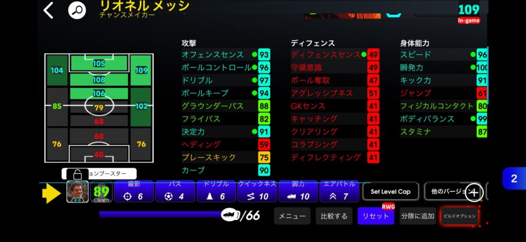 今回のメッシはフィジカル数値80まで上げても他の数値を上げやすく、育成しやすかったです!
