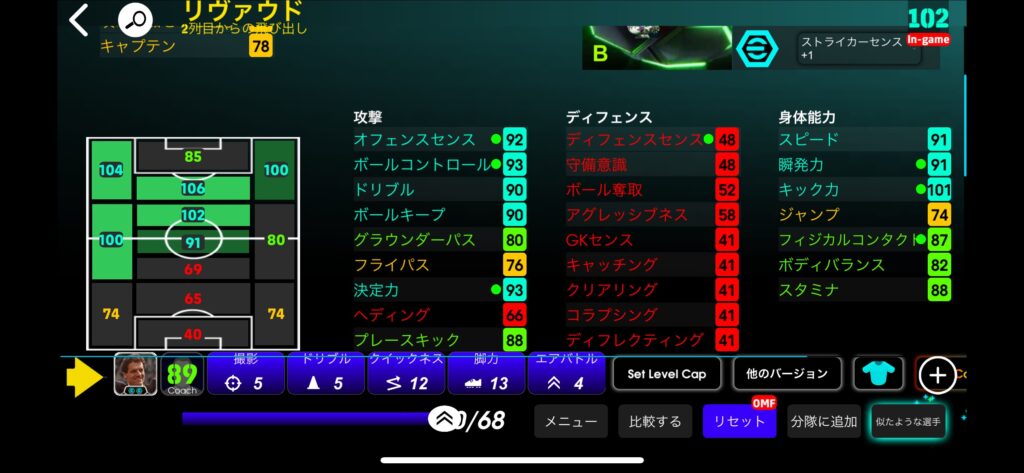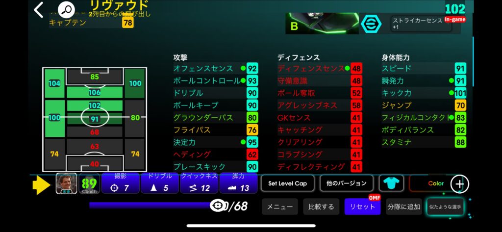 - 育成ポイント:フィジカルを上げて、ロースクリーマーを撃つときに体勢を崩しにくくしました!モメンタムドリブルが発動している時は理不尽な攻めが際立ちます!