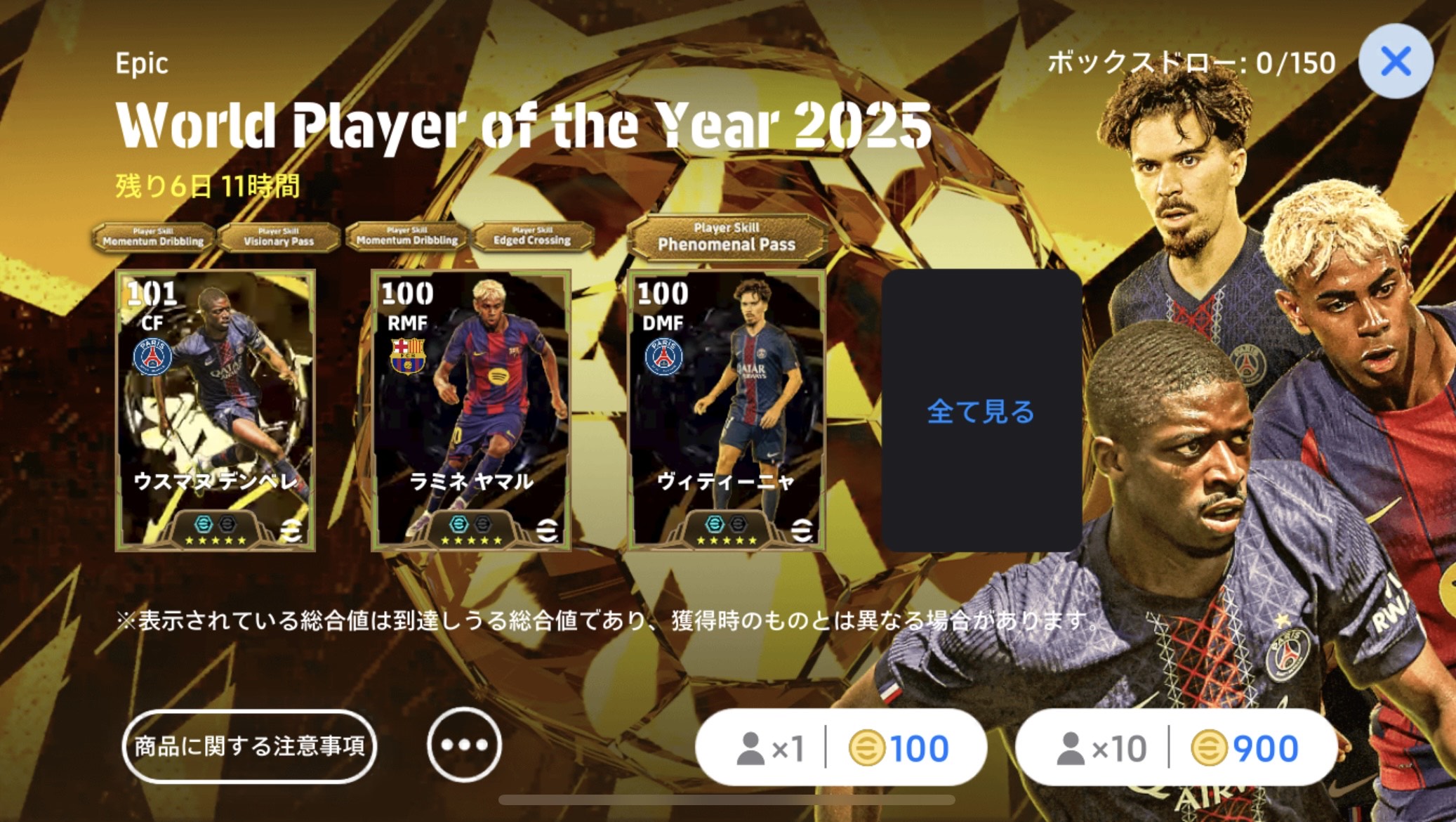 全150枠のボックスガチャ形式で、PSGのウスマヌ・デンベレ、若きバルセロナのスター ラミネ・ヤマル、そしてPSGのヴィティーニャと豪華ラインナップ。